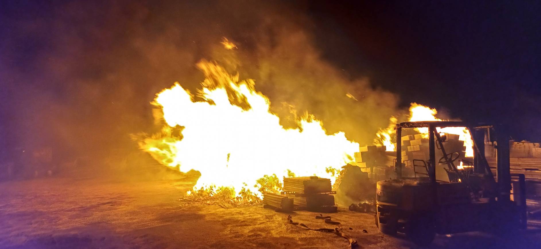 延燒將近4小時!澎湖湖西鄉火警燒毀大批木棧板 1輛堆高機半毀