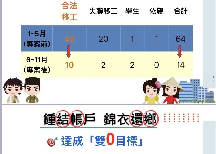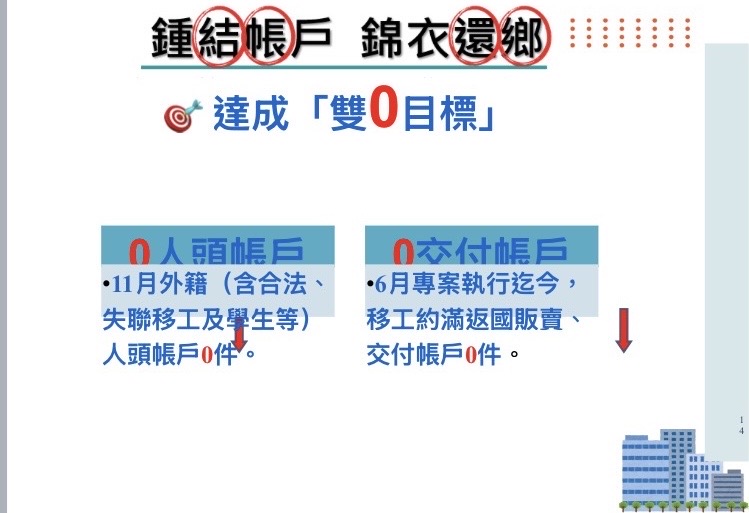 警政署統計顯示,近三年外來人口淪為詐騙集團人頭帳戶者,以合法移工占比逾七成。為防制移工帳戶遭濫用,苗栗縣警察局攜手縣府勞青處自今年6月起推動「結帳還鄉」專案,透過教育宣導、夥伴參與及溯源執法等策略,結合駐臺機構、企業及仲介公司,協助移工在期滿返國前結清金融帳戶。統計顯示,移工涉及人頭帳戶案件由1至5月的44件,降至6至11月僅10件,11月更達成「零發生」,專案成效顯著。