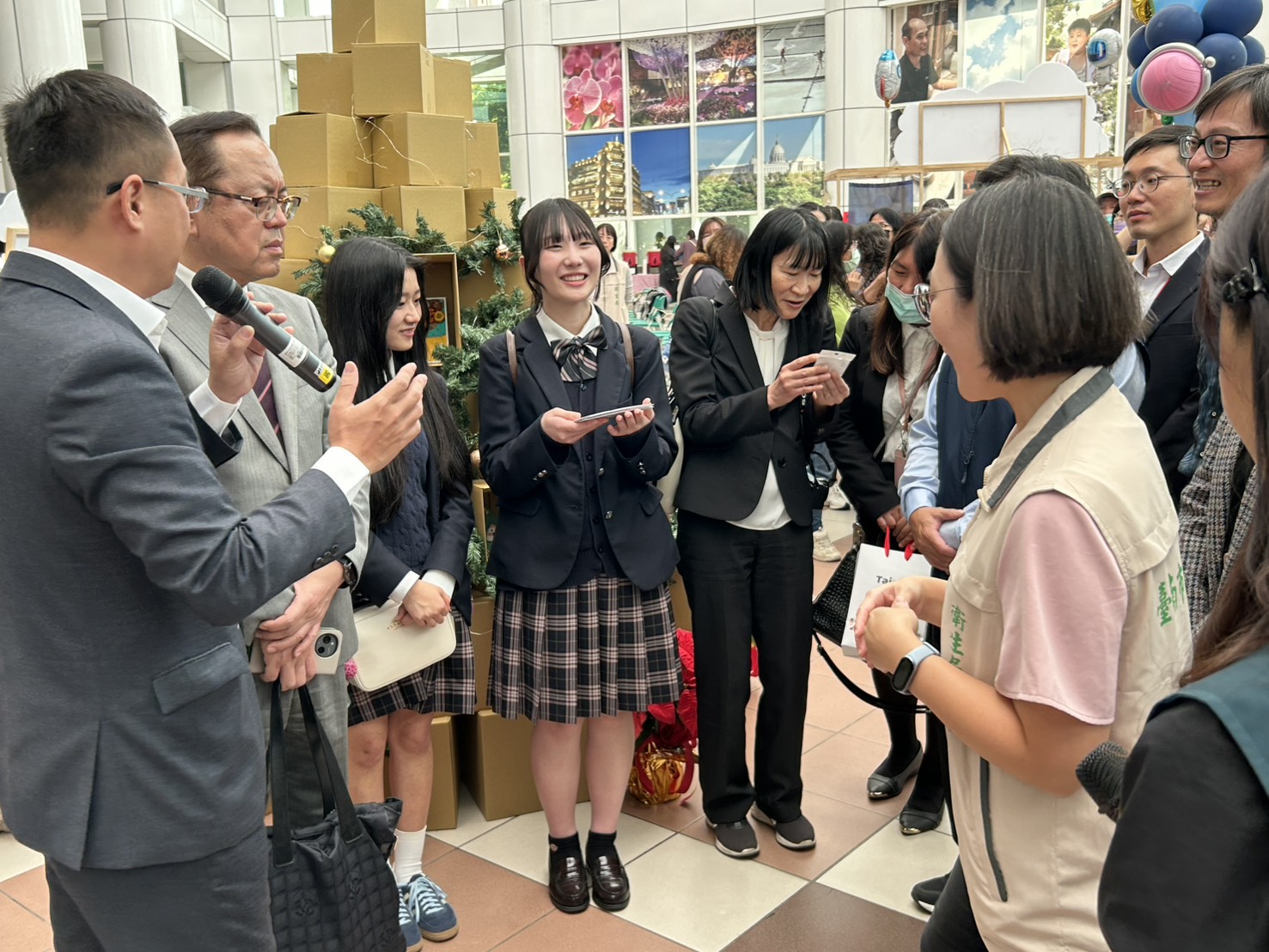 台南市政府今(15)日起至12月20日在永華市政中心二樓中庭廣場舉辦「114年度國民健康業務成果展」,以「台南健康宇宙城」為主題,藉由宇宙象徵健康照護服務的範圍,並以不一樣的星球代表不同單位,向市民介紹健康服務的多元面向。今日上午舉辦開幕記者會,適逢日本山形城北高等學校師生因「修學旅行」到訪市府,市長黃偉哲也特別邀請師生參觀展覽,並現場體驗肌耐力訓練,學生們都大呼有趣。