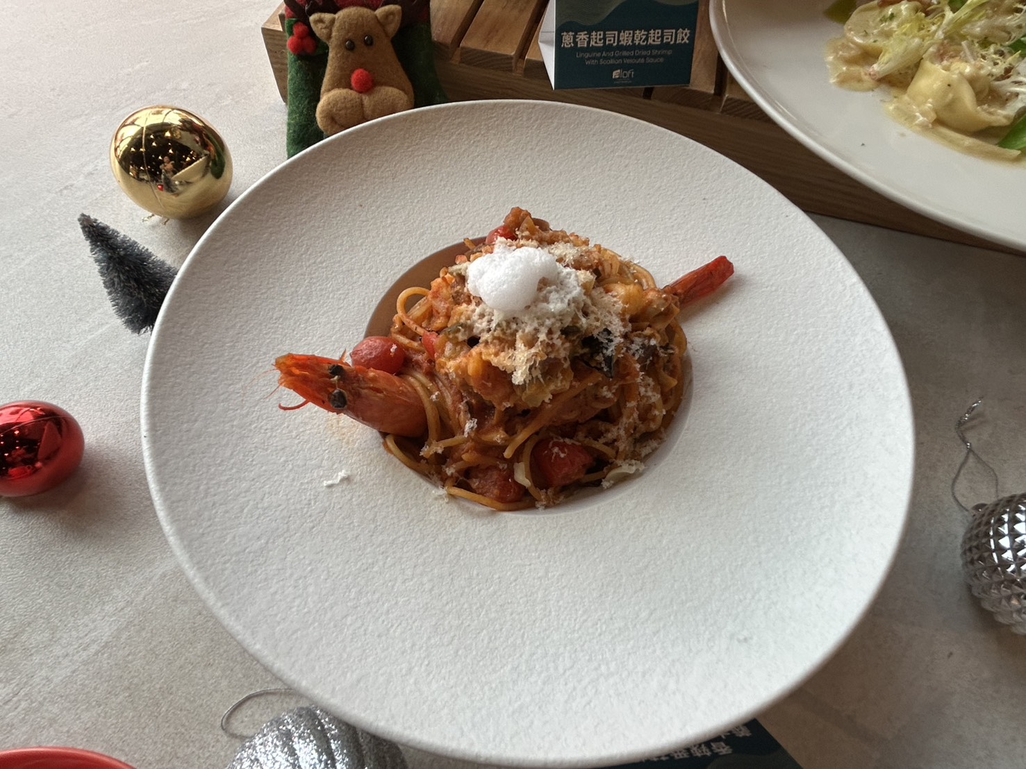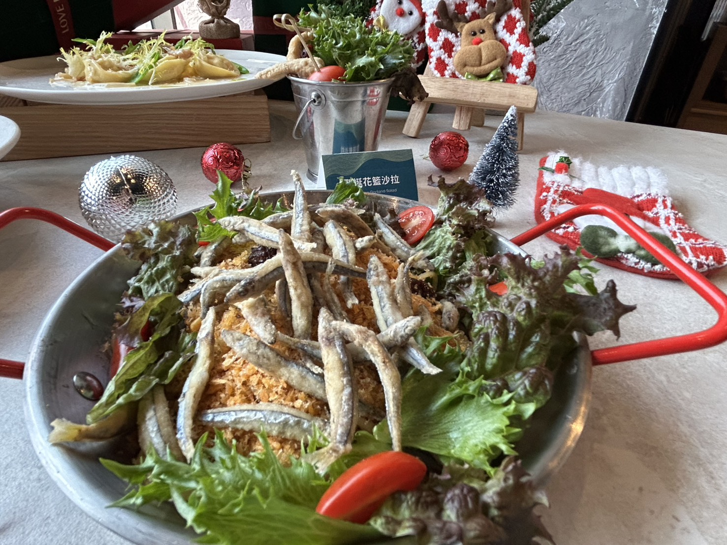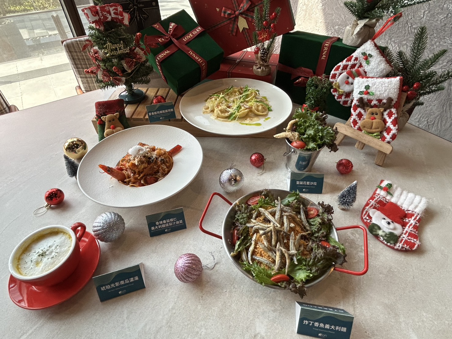 「聖誕花籃」以清爽生菜沙拉搭配炸虱目魚柳、莫札瑞拉起司,鹹香黑橄欖與清爽微酸的蕃茄,為整體風味帶來平衡,售價$120。「琥珀光影南瓜濃湯」,鮮奶油拉花與南瓜籽點綴,為節慶揭開序幕,售價$120。「炸丁香魚義大利麵」是源自義大利西西里島的傳統風味,以鯷魚、甜葡萄乾、蒜香、微辣麵包酥為基底,鹹甜辣層次交織,再融合台灣熟悉的炸丁香魚,展現異國料理語彙與在地飲食間的巧妙對話,售價$480。「香辣番茄蝦仁義大利麵搭茄汁燉菜」以鮮紅番茄與彈嫩蝦仁呼應聖誕意象,結合法式燉蔬料理手法,傳遞團聚時刻的暖意,售價$520。