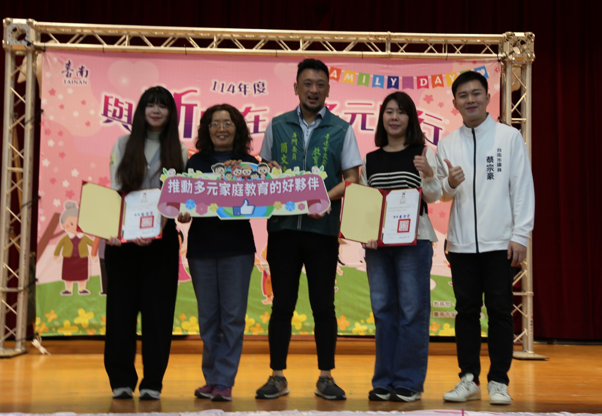 ▲教育局簡文達專委、公誠國小蕭敏華校長及市議員蔡宗豪與新住民學習中心獲獎人員陳奕君。(教育局 提供)
