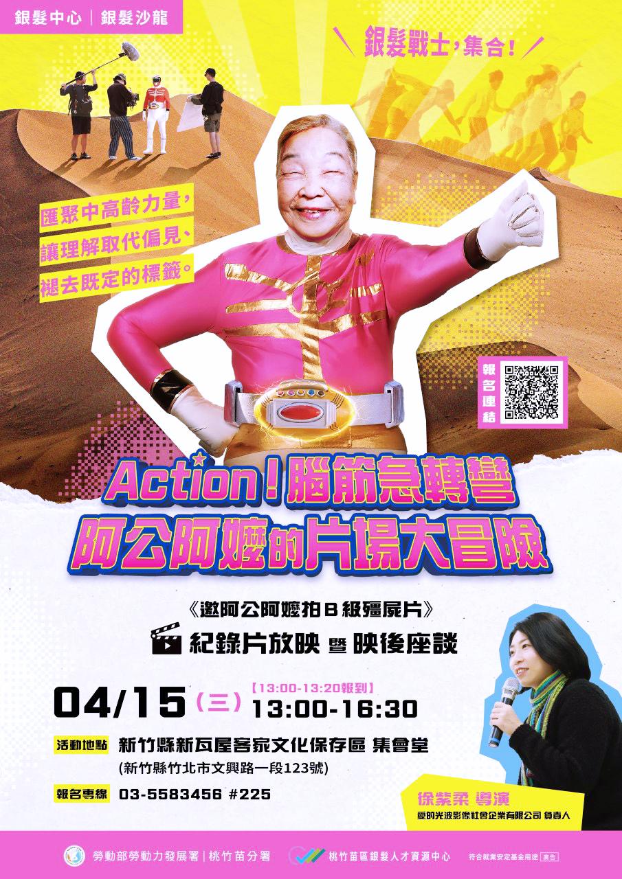 久離職場後想開啟職涯第二春的中高齡及高齡者,時常不知從何開始,勞動部勞動力發展署桃竹苗分署銀髮人才資源中心於4月15日(星期三),在新竹縣新瓦屋客家文化保存區的集會堂舉辦「《邀阿公阿嬤拍B級殭屍片》紀錄片放映暨映後座談」,藉由紀錄片的放映及與導演徐紫柔對談交流,透過真實故事的分享,提升銀髮族群學習與再就業的信心,並激勵更多中高齡及高齡者延續職涯、再展長才。活動採取線上報名( https://forms.gle/PwDbQ7A3eKaUQQfr8 ),歡迎有興趣的民眾踴躍參與!