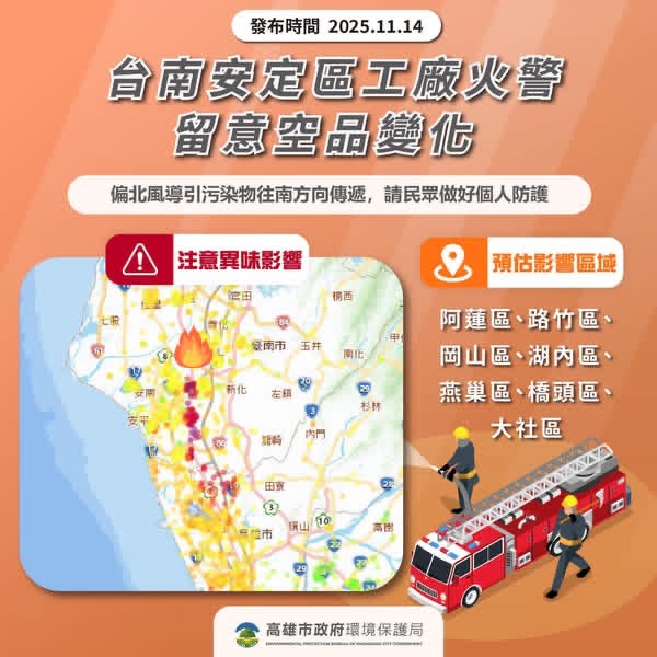 不過高雄市環保局接獲通知,由於風向關係,導致污染物往南飄,目前印象高雄阿蓮、路竹、岡山、湖內、燕巢、橋頭以及大社區。