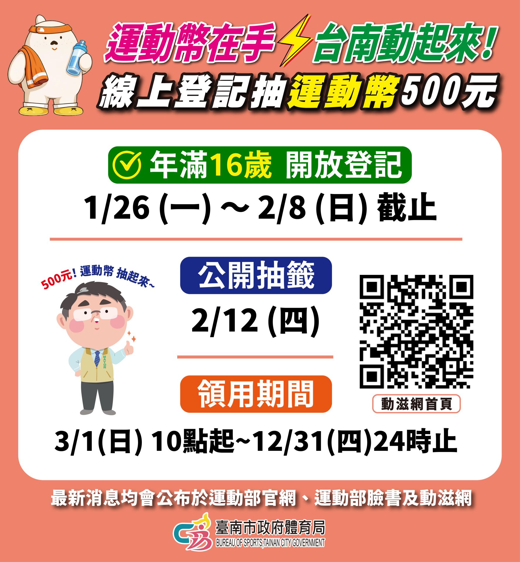 運動部115年推出「運動幣」,並採登記抽籤方式辦理。凡年滿16歲(民國99年1月1日前出生)且設籍國內之國民,均可於115年1月26日上午10時起至2月8日24時止完成登記,並將於115年2月12日辦理公開抽籤,有機會獲得500運動幣,歡迎市民把握機會踴躍參與。