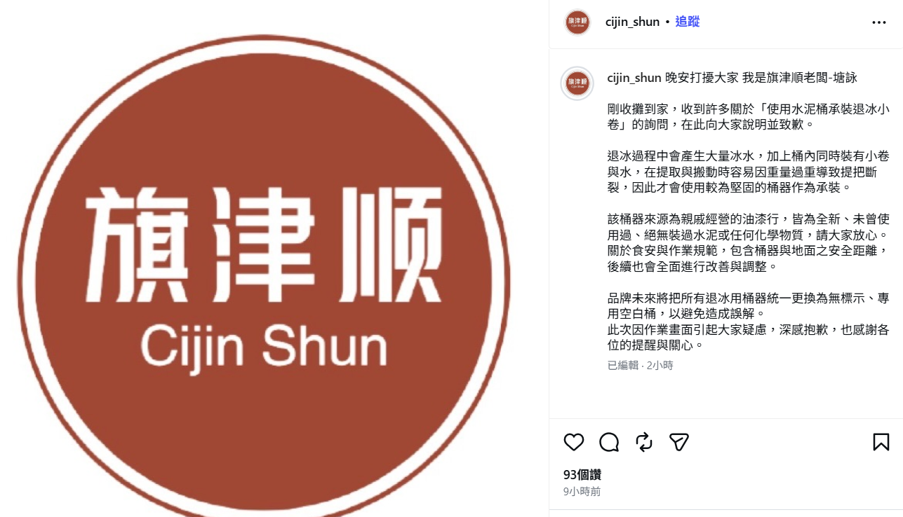 關於食安與作業規範,包含桶器與地面之安全距離,後續也會全面進行改善與調整。品牌未來將把所有退冰用桶器統一更換為無標示、專用空白桶,以避免造成誤解。此次因作業畫面引起大家疑慮,深感抱歉,也感謝各位的提醒與關心。