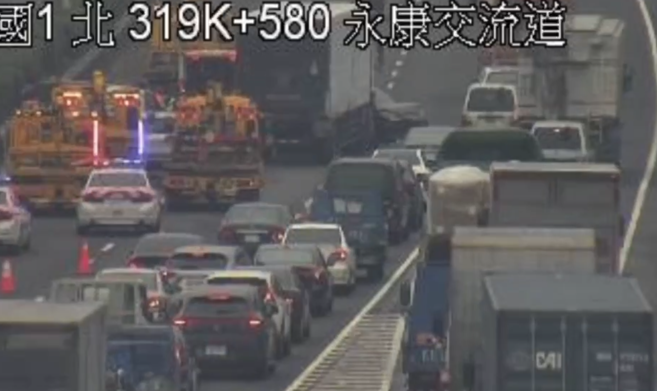 國道1號永康路段5車相撞1車翻覆 僅路肩可通行車流回堵