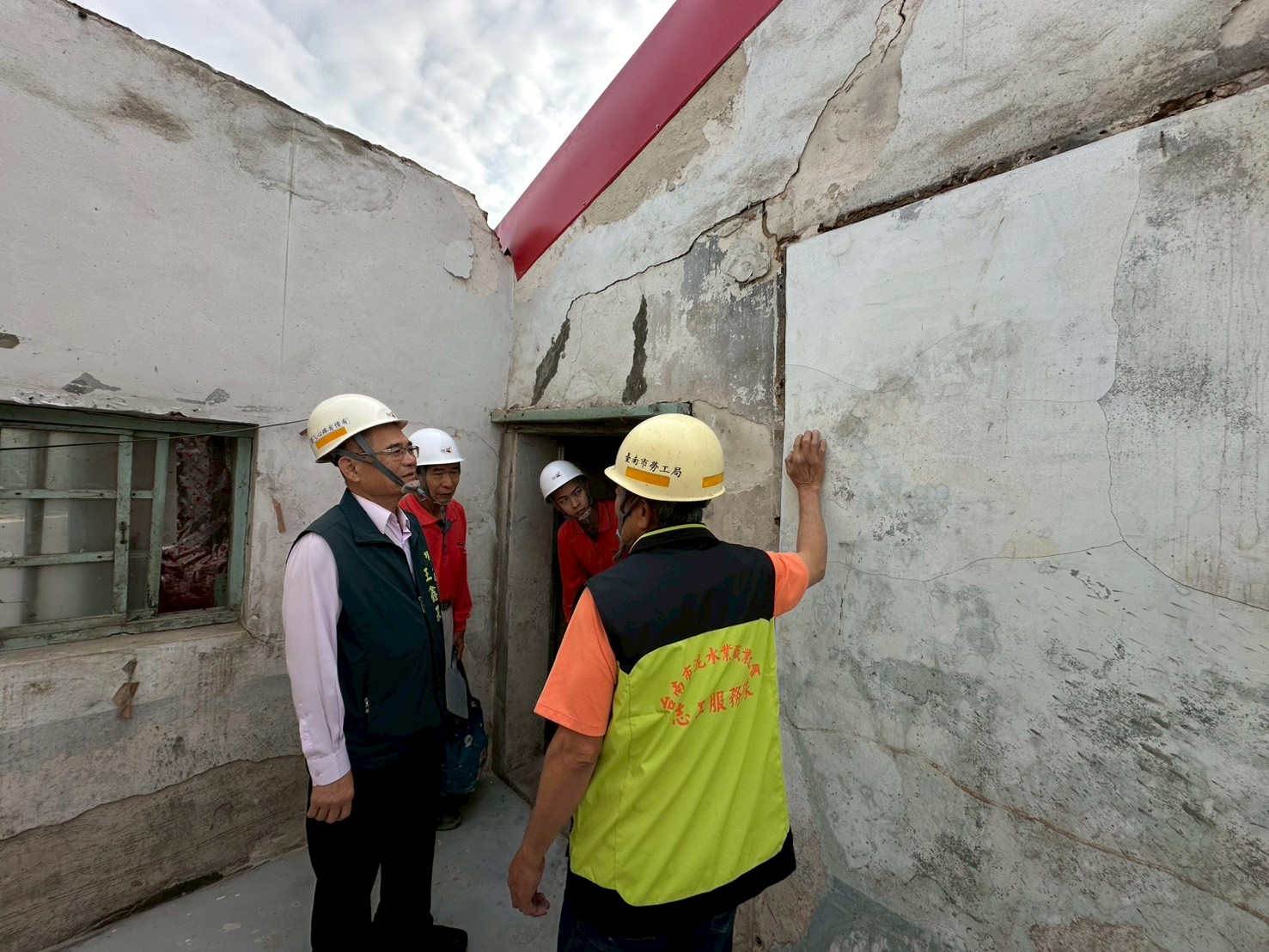 ▲勞工局長王鑫基到關廟區修繕場關心電氣及泥水工會志工施工狀況。(勞工局 提供)