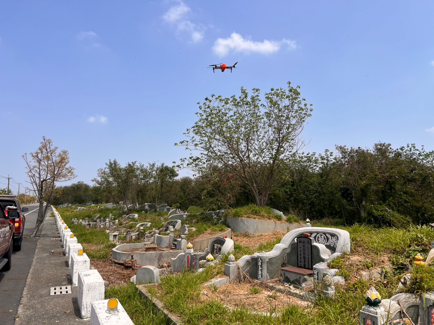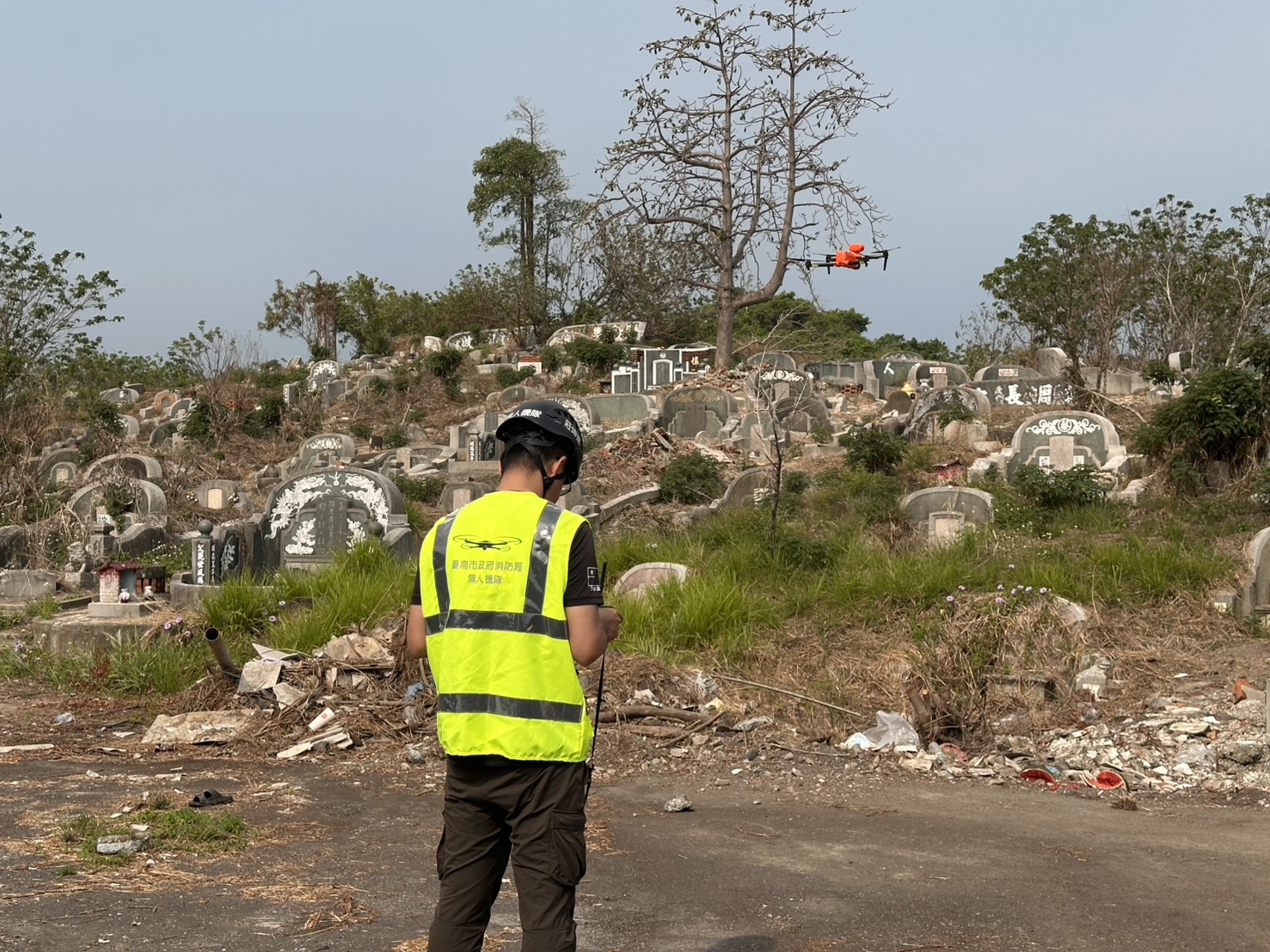 清明連假掃墓,台南市消防人員啟動無人機防範墓地火災。圖/台南市消防局提供