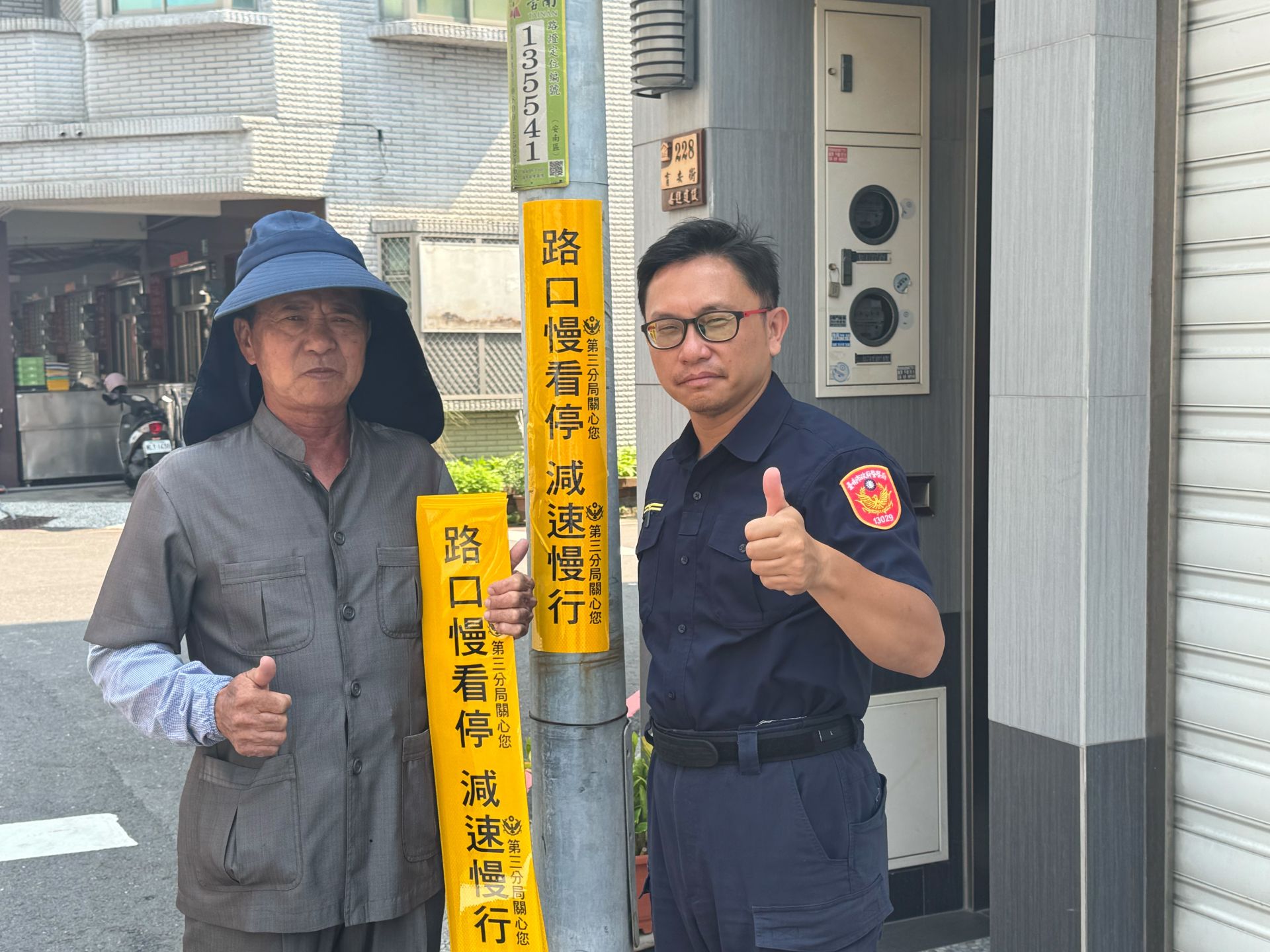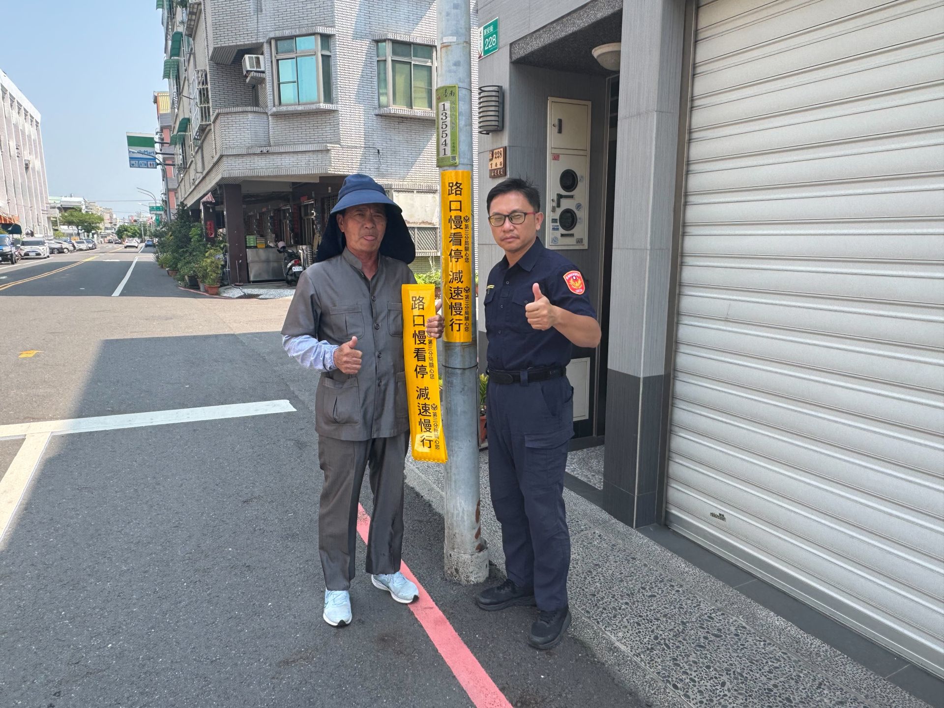 ▲安順里長陳進明及和順派出所長許力生將反光貼紙「路口慢看停」貼在易危險的燈柱上。(記者黃雋淮 翻攝)