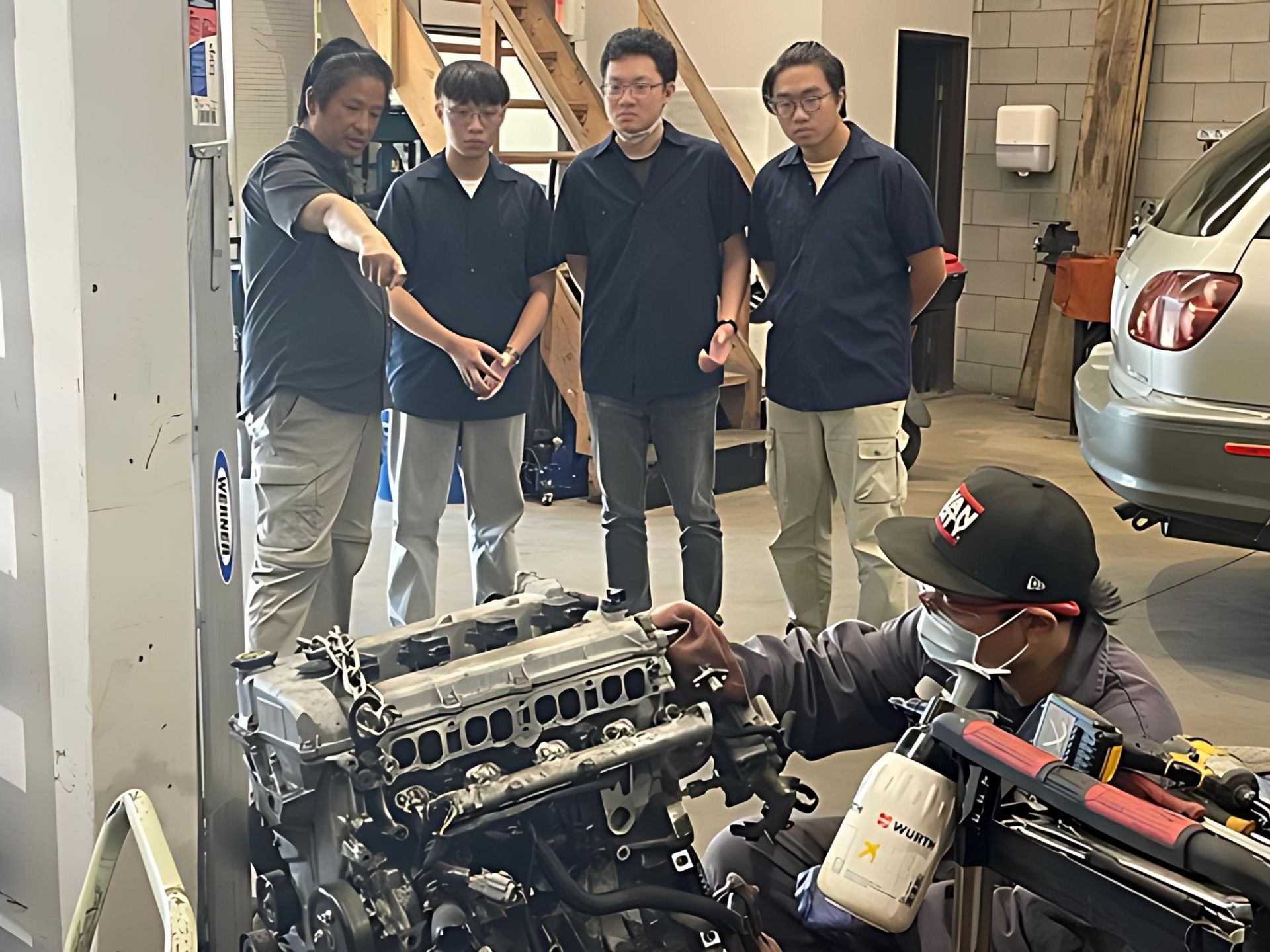 本次計畫由崑山科大工學院江智偉院長領隊,於7月24日至8月25日前往加拿大MAXEME AUTOMOTIVE SERVICE LTD 進行全程專業訓練,實習主題聚焦於 Honda Civic 2000 改裝為電動車的專案,學生實際參與電池模組整合、傳動系統調校、充電設施設計與車用晶片應用等多項技術任務。過程中,學生在專業工程師的指導下,完成從零件配置、電氣測試到充電模組調校的全流程作業,將課堂理論與實務研發緊密結合。