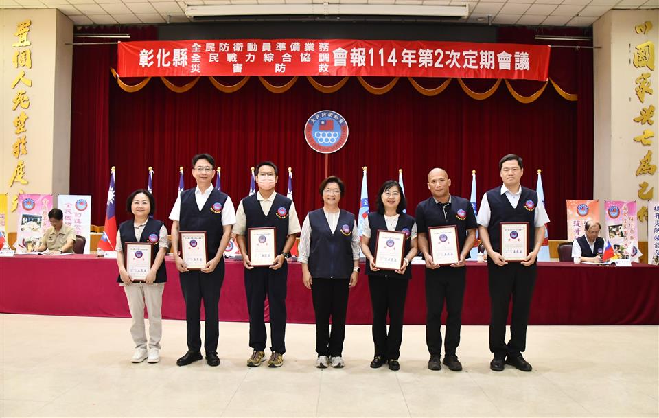 彰化縣114年動員、戰綜及防災會報第2次定期聯席會議,14日在彰化縣警察局6樓禮堂舉行,由縣長王惠美擔任召集人,並邀請行政院動員會報專委鄭慧美、後備指揮部參謀長薛少將、中部地區後備指揮部指揮官陶少將等人出席指導。王惠美藉由定期演練、城鎮韌性演習等形式強化各單位應變能力,協助民眾提升自助,落實各項動員準備及提升災害防救效能。