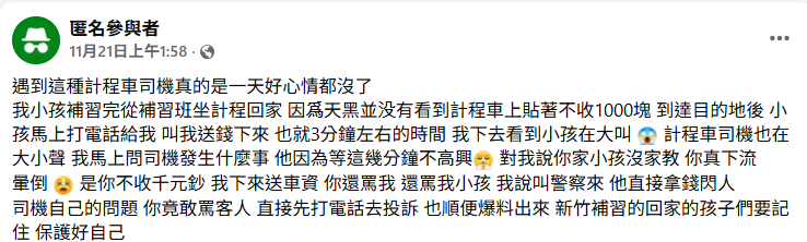網友在臉書社團新竹爆料公社發文指出,小孩補習完從補習班坐計程回家,因爲天黑並没有看到計程車上貼著不收1000塊,到達目的地後,小孩馬上打電話給我,叫我送錢下來,也就3分鐘左右的時間,我下去看到小孩在大叫,計程車司機也在大小聲,我馬上問司機發生什麼事,他因為等這幾分鐘不高興,對我說你家小孩沒家教,你真下流。