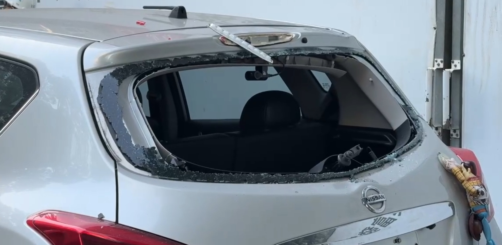 台中自小客車後擋風玻被建築工地掉落的水管砸破。翻攝畫面