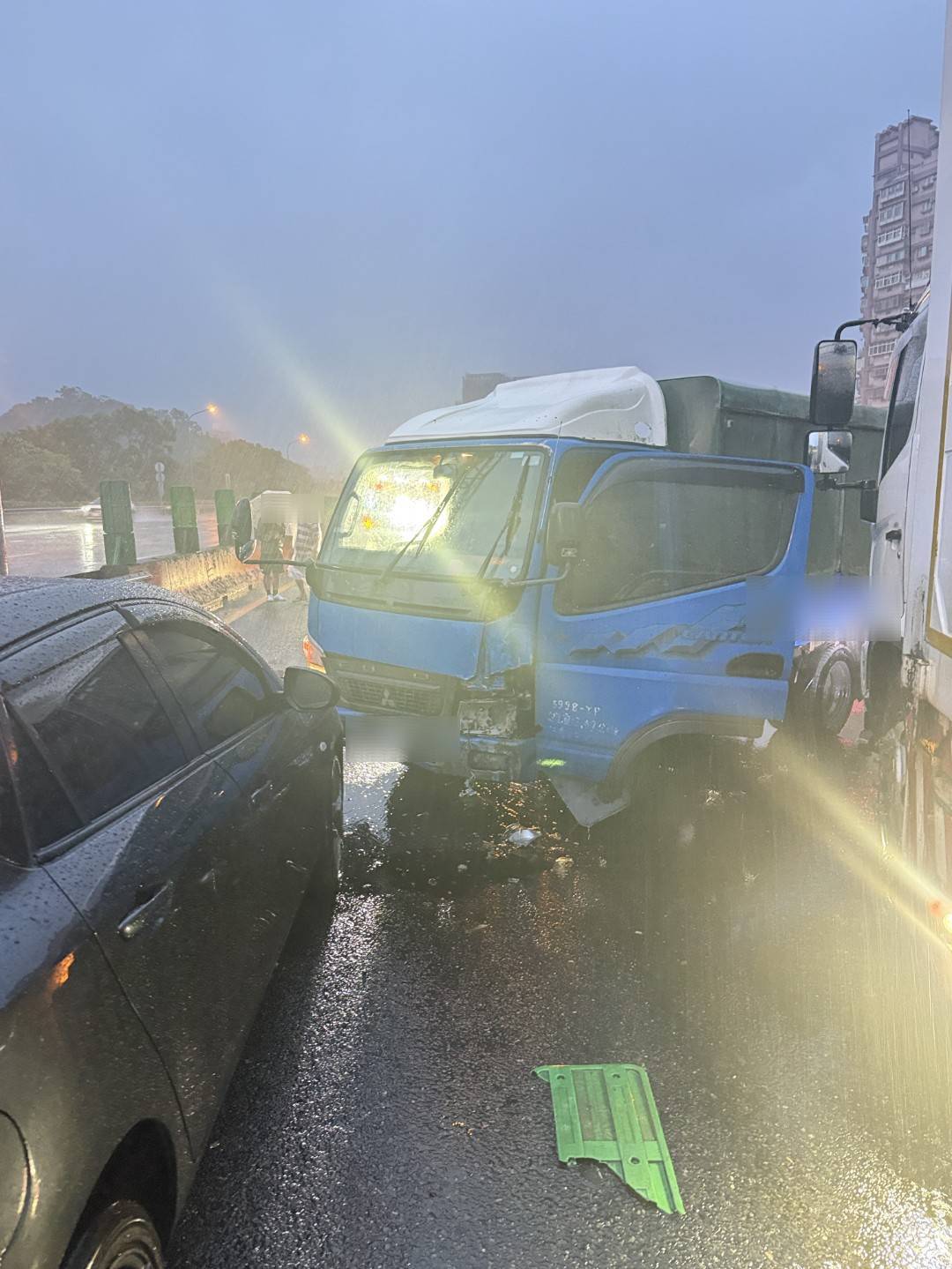 經查,62歲高姓男駕駛自小貨車因不明原因自撞護欄停於內側車道,高男下車至後方擺放故障標誌時,遭內線30歲傅姓男子駕駛的自小客車撞擊,高男拋飛到南向內側車道,並疑似遭其他車輛撞擊,26歲賴姓男子駕駛的大貨車停於北向現場右後方幫忙警戒,遭後方48歲徐姓男子駕駛營半聯撞擊。高男經消防隊員到場判定明顯死亡未送醫,徐男受困車內經救出送內湖三總救治,各車駕駛酒測值待檢測,詳細的肇事發生原待調查釐清。現場5車道,占用內側車道處理,事故現場尚未排除仍在處理中。