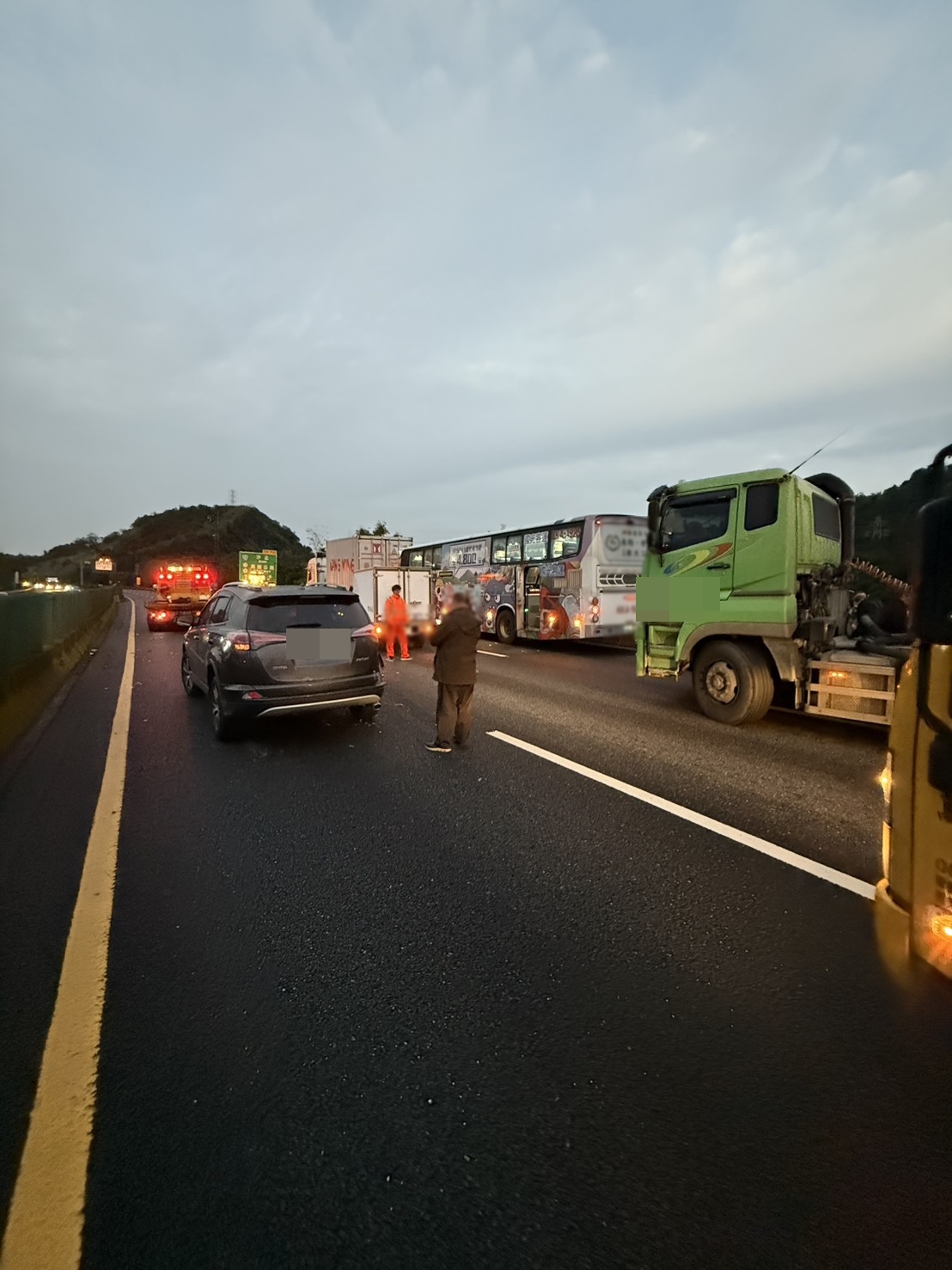 【Lai傳媒、記者爆料網/周庭慶/報導】國道1號南下7.9公里路段今(19)日清晨6點多發生車禍,現場有4輛車相撞,包括1輛國光客運、1輛自小客車、1輛小貨車及1輛大貨車,造成客運車上6人受傷送往汐止國泰、長庚醫院救治,無生命危險,現場車流一度回堵,目前國道警察第一大隊還在調查處理中。
