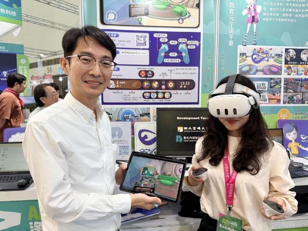 在數位教育領域方面,數位內容設計研究中心副教授王政弘團隊展示「EWova教育元宇宙平台」。該平台整合虛擬實境(VR)、延展實境(XR)、人工智慧(AI)與物聯網(IoT)技術,建構沉浸式虛擬學習環境,讓使用者可透過虛擬分身進入數位教室進行互動式學習與跨場域協作,並可將抽象知識轉化為具象的3D學習情境。系統並可透過數據分析掌握學習歷程,提升遠距教育與職業培訓的教學成效,未來可應用於校園教學、企業培訓與多元學習場域。