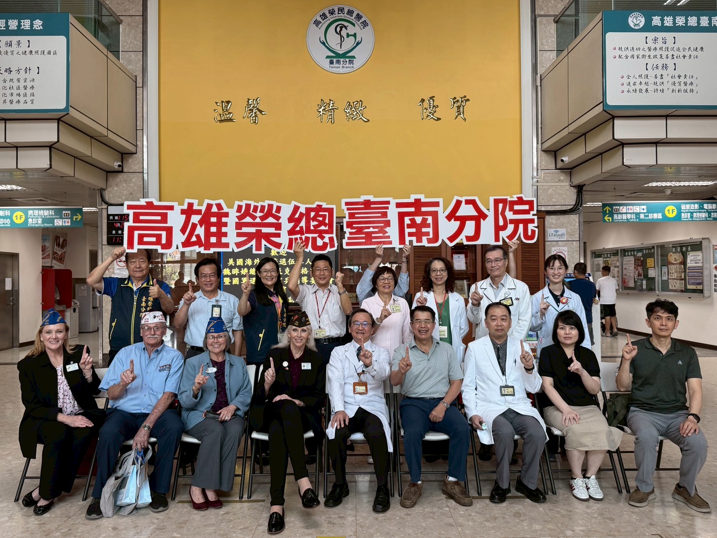 ▲美國海外作戰退伍軍人協會(VFW)訪團蒞臨高榮臺南分院,由院長鄭名芳(前排中)率團隊接待,與總會長魏眸娥(前排左4)及輔導會參事倪邦臣(前排右4)於大廳合影,展現國際交流及榮民醫療服務的高度肯定。(圖/高榮臺南分院提供)