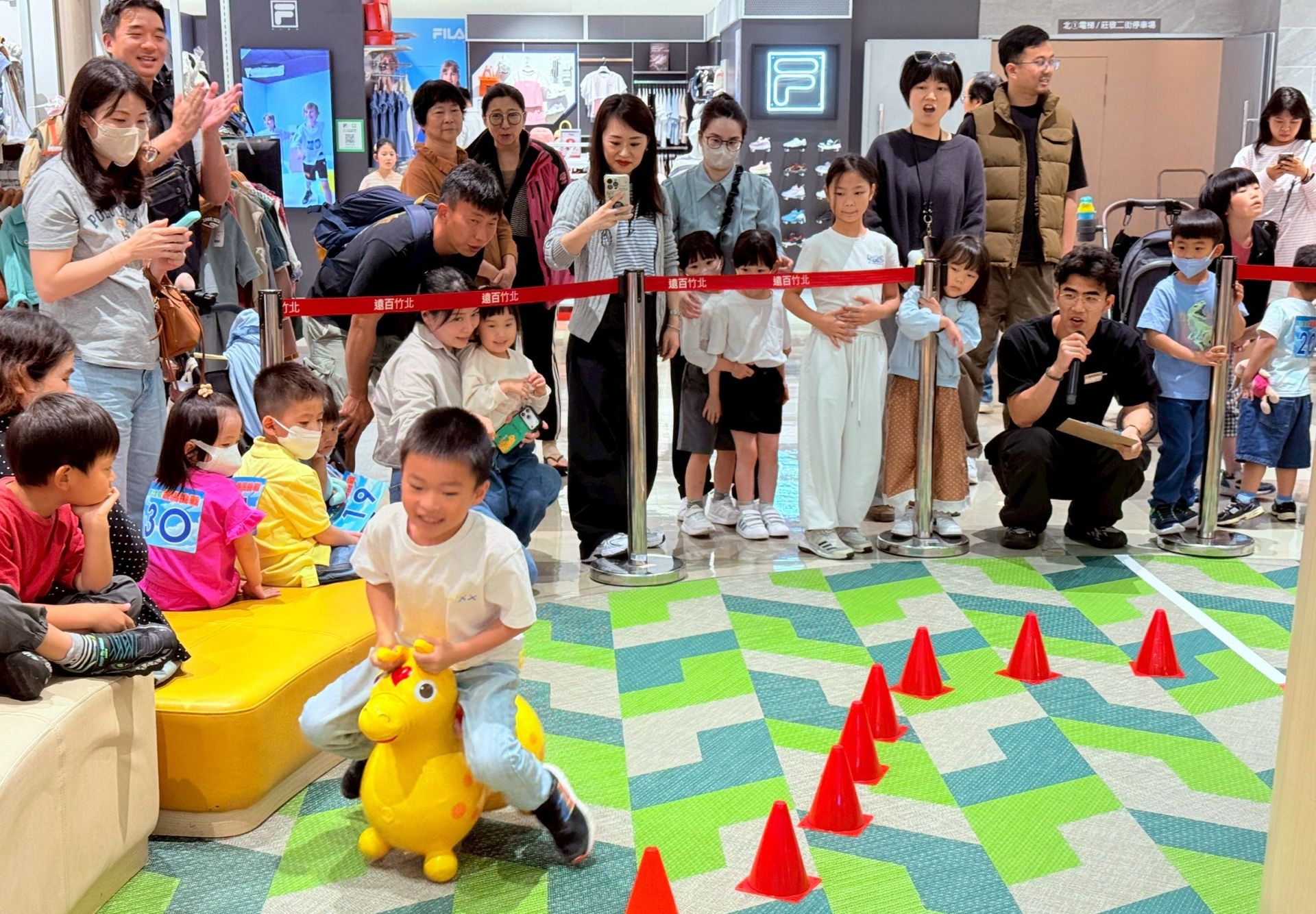 竹北遠百於連假期間特別規劃多項動態體驗活動,其中「K-POP隨放隨跳挑戰賽」吸引近百位學生熱情參與,現場聚集滿滿人潮圍觀,也帶動一旁韓國物產展買氣;另針對學齡前的小朋友們舉辦「馬力全開跳跳馬障礙競賽」,讓不同年齡層的孩子們都能在歡笑中度過充滿活力的兒童假期。