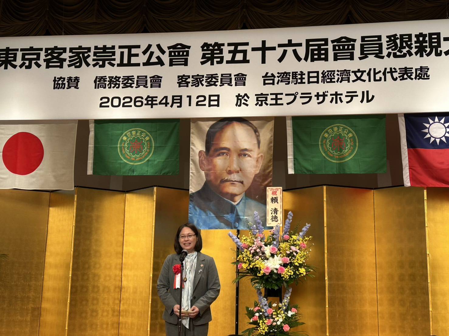 今年東京客家崇正公會會員懇親大會在東京京王大飯店舉辦,有駐日文化經濟代表處公使周學佑、新竹縣長楊文科、苗栗縣副縣長賴香伶、台灣客家聯合總會邱榮光總會長、全球台灣客家聯合總會黎萬堂總會長、日本台灣友好議員連盟特別顧問小磯明、前衆議院議員龜井亞紀子及僑界代表等貴賓與會。