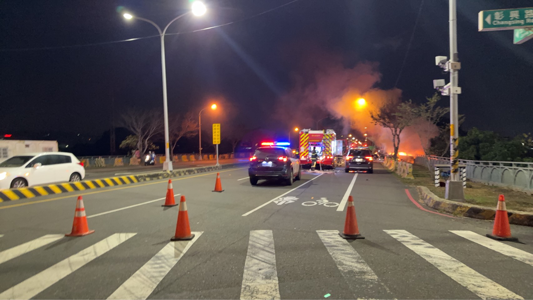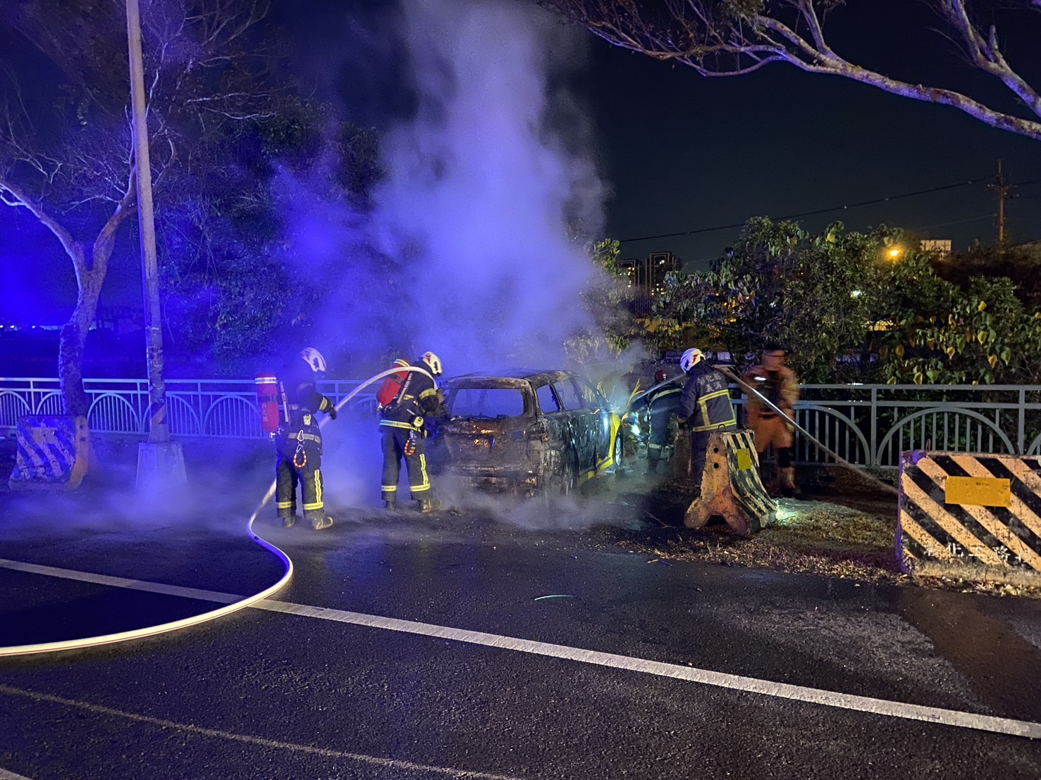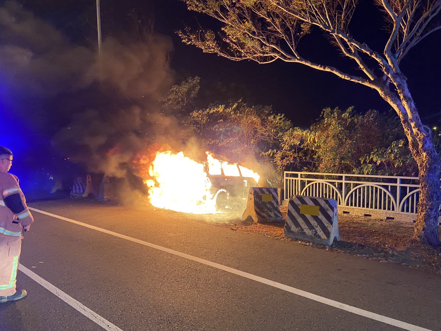 就在警方救人的同時,支援警力也火速趕到,立刻擺放交通錐進行管制,避免其他車輛遭殃。消防隊接到通報後也是用「飛」的趕來,幾支水柱齊發,才把這輛「火車」給撲滅。所幸駕駛只是受到驚嚇,送醫檢查後沒什麼大礙,撿回一條命!