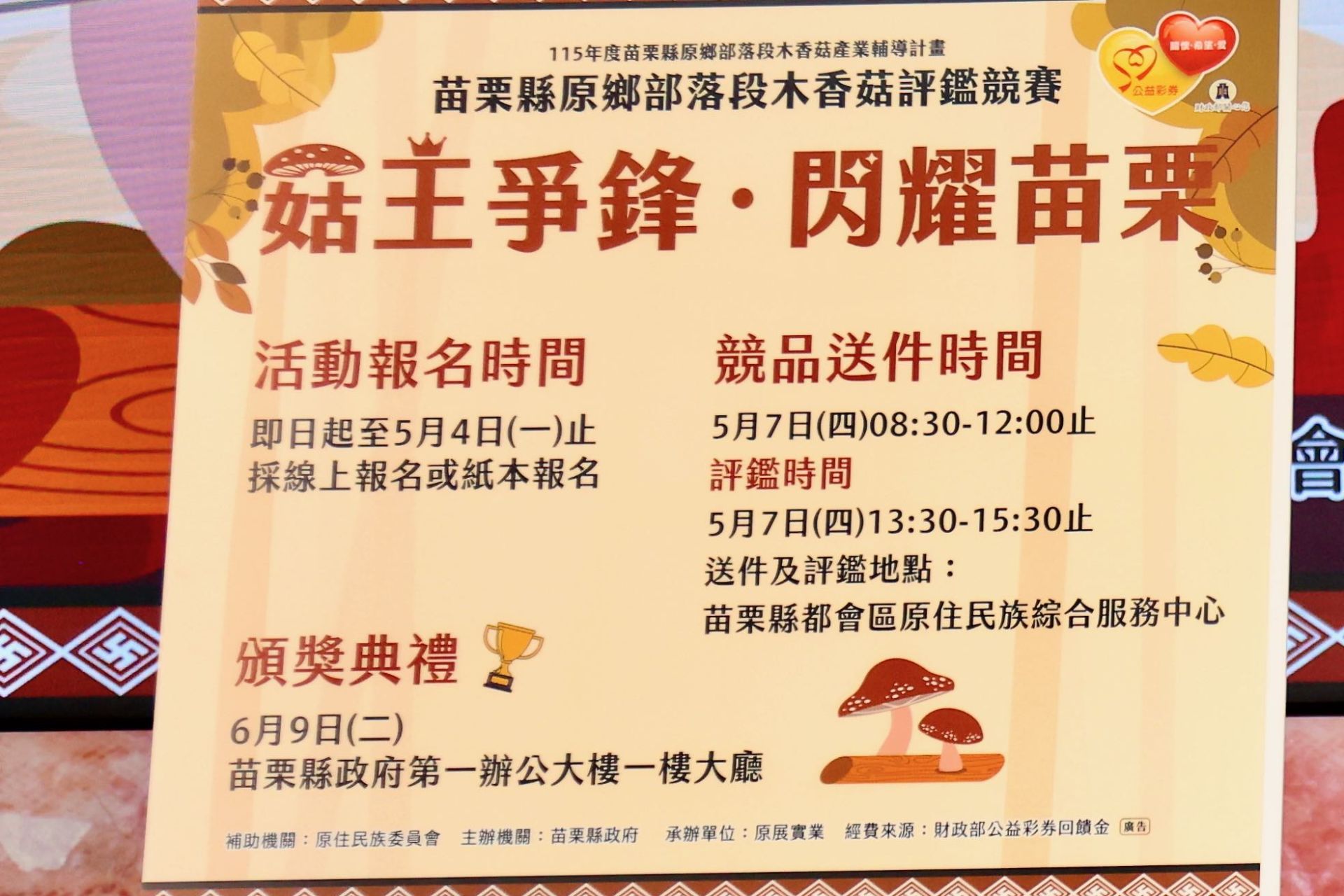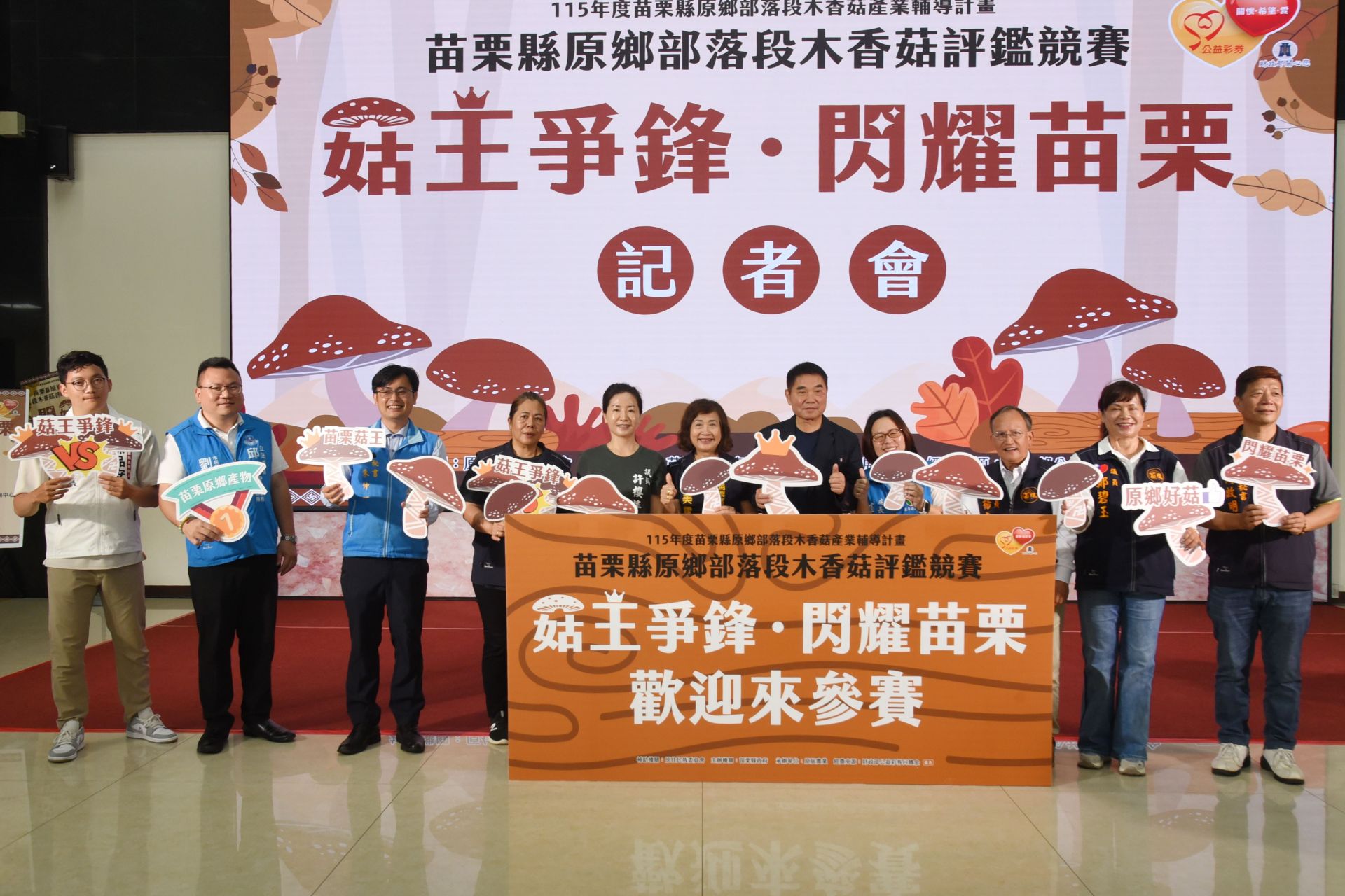 為了讓更多民眾瞭解苗栗原鄉部落段木香菇的卓越品質與獨特風味,苗栗縣政府原住民族及族群發展處特別舉辦「菇王爭鋒.閃耀苗栗」原鄉部落段木香菇評鑑競賽,今22日啟動記者會,菇王爭鋒活動旨在透過專業評鑑機制,展現縣原鄉部落菇農付出的心力與耕耘後的成果並展現原鄉部落段木香菇的優良品質與風味。