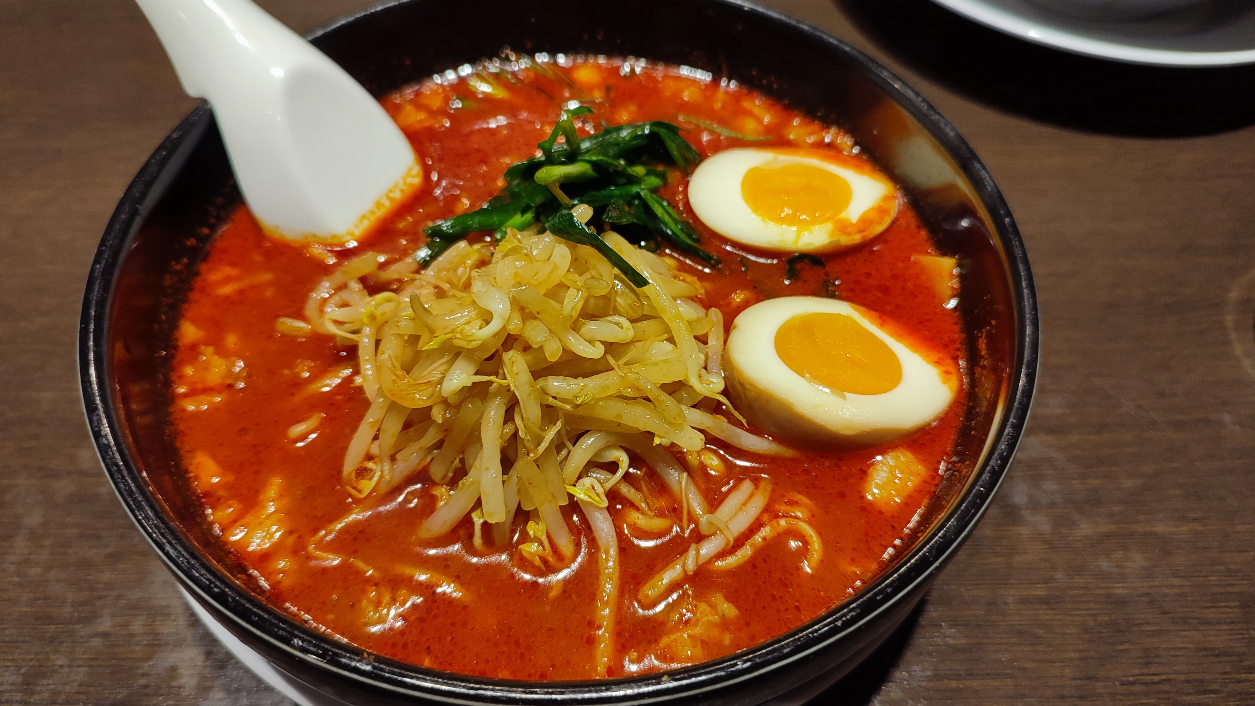 湯面鋪滿爽脆青蔥,對切的半熟溏心蛋,金黃蛋黃緩緩流出,為整體風味增添柔和收尾。