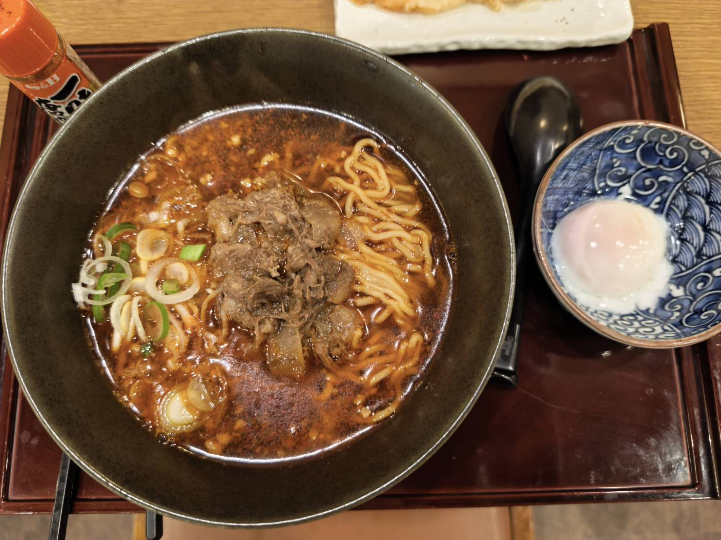 特別建議搭配一顆溫泉蛋(半熟卵)。將溫潤的蛋黃劃破,讓蛋液緩緩流入口感Q彈的麵條與濃郁湯頭中,不僅增加了層次感,更讓整體風味變得滑順平衡。此外,若再撒上一點日本 S&B 七味粉,更能提煉出松阪牛的肉香。