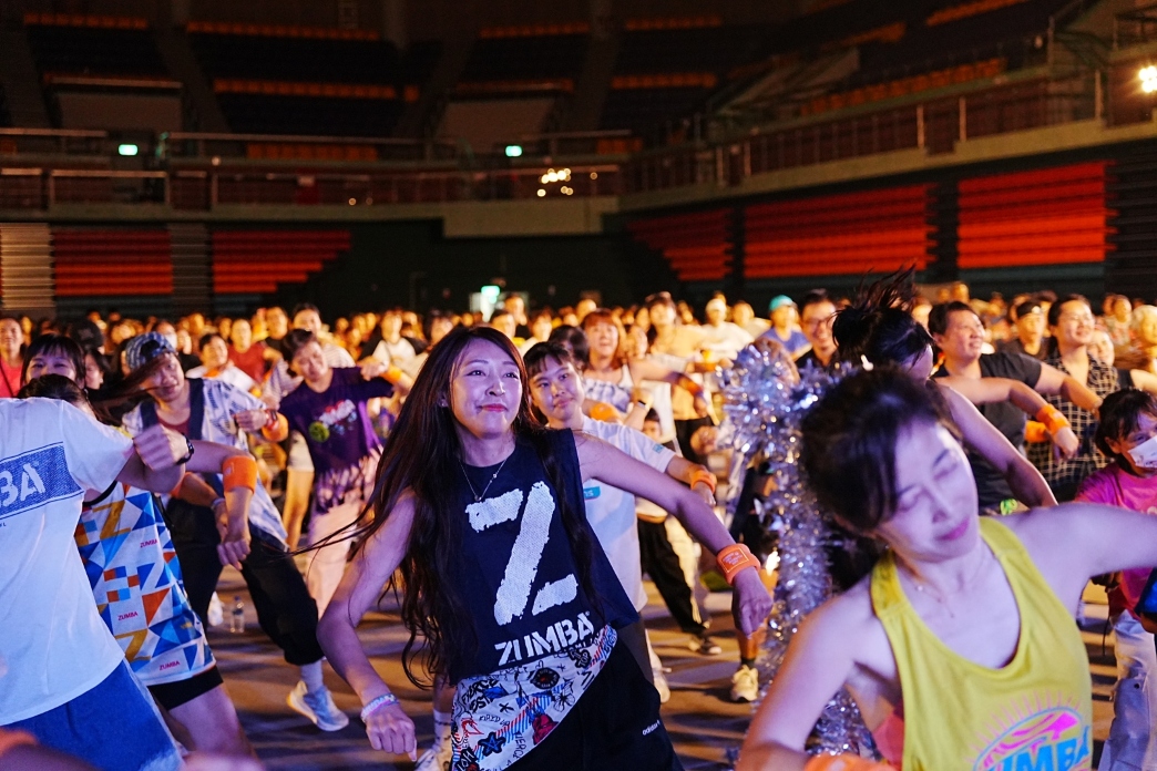 中央氣象署今日下午針對屏東縣發布大雨特報,但活動仍然有超過千人的民眾不畏風雨,齊聚在體育館隨著音樂節奏舞動、揮灑汗水,不分年齡的大小朋友盡情享受「螢光ZUMBA夜派對」的運動魅力。