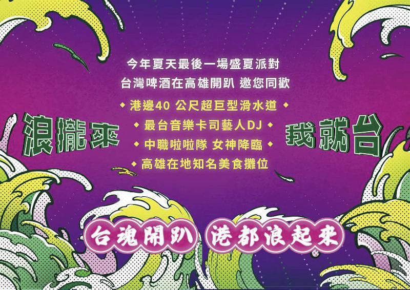 台灣啤酒宣布,今年夏天壓軸的「南台灣最潮水派對」將於 9 月 26 日至 10 月 5 日,在高雄流行音樂中心海風廣場熱鬧登場。長達9天的活動以「浪攏來,我就台」為主題,結合音樂、水上活動、美食餐車與台啤最新鮮的啤酒,打造專屬於台灣消費者的夏日派對氛圍。