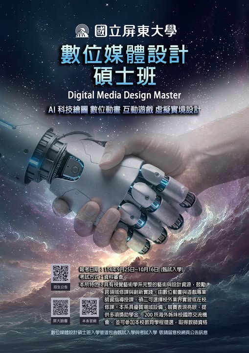 115學年屏大數位媒體設計碩士班開始招生,我們有視覺藝術學系完整的藝術與設計資源,鼓勵跨領域修課與創新實踐。由數位動畫與遊戲專業師資指導授課,碩二可選擇校外業界實習或在校修課。本系具優質場域設備,競賽表現亮眼,提供多項獎助學金,200所海外姊妹校國際交流機會,並可參加本校教育學程徵選,取得教師資格。