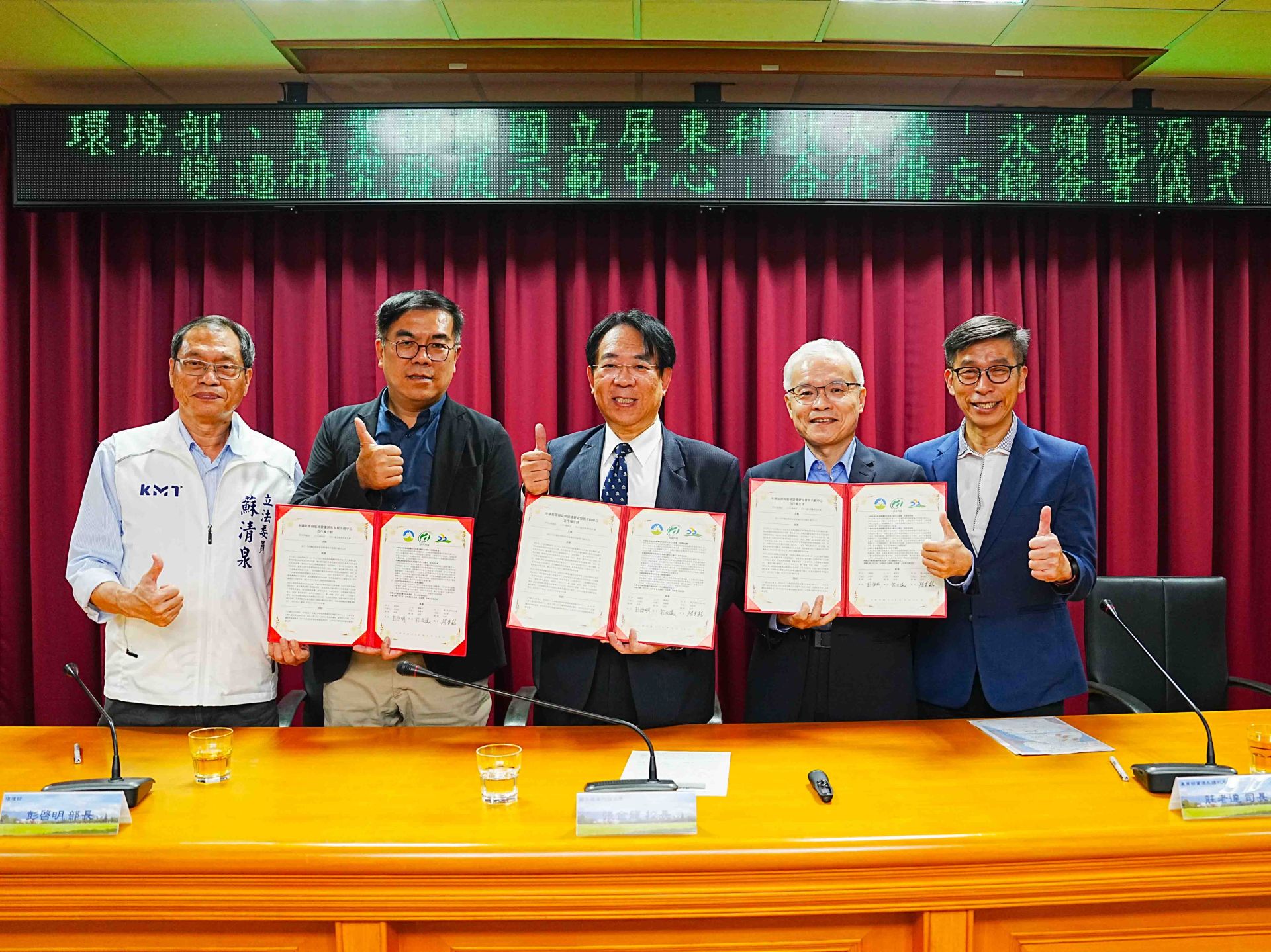 國立屏東科技大學與環境部、農業部正式簽署合作備忘錄(MOU),共同推動「永續能源與氣候變遷研究發展示範中心」。簽署儀式由環境部長彭啓明、屏科大校長張金龍,以及農業部資源永續利用司長莊老達代表完成,象徵產、官、學、研跨域合作,攜手邁向2050淨零轉型。