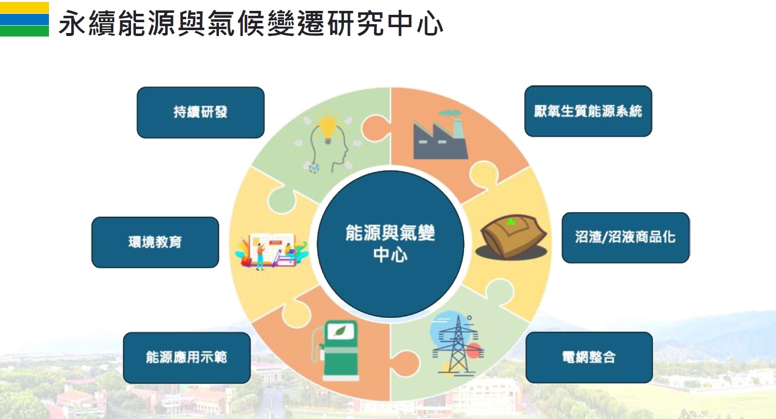 「永續能源與氣候變遷研究發展示範中心」將設於屏科大校區內,採《促參法》第46條模式設置,由環境部出資建設,並引進民間專業能量經營。中心將興建研發大樓與畜牧廢水集中處理場,規劃厭氧生質能源系統、沼渣液商品化、電網整合、能源應用示範與環境教育等功能,處理規模可達25,000頭豬隻或相當量畜牧廢棄物。