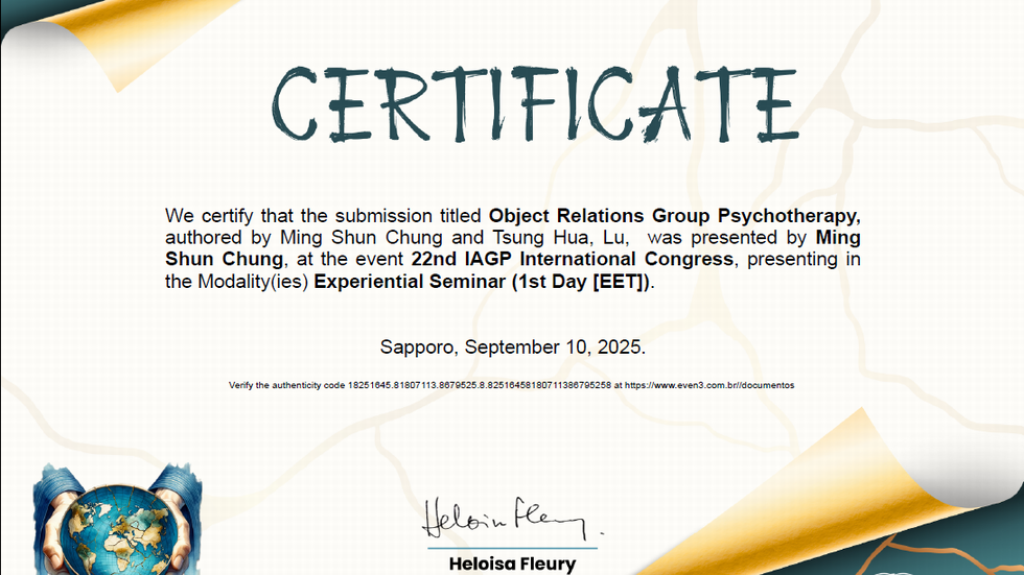 鍾醫師是台灣團體心理治療著名專家,在2025年日本扎晃的國際團體心理治療大會上,與成功醫院的呂宗樺醫師共同帶領工作坊,將自己的多年經驗與國際的專家分享並傳承給國際的同好,讓台灣的團體心理治療也可以在國際上發光發熱。