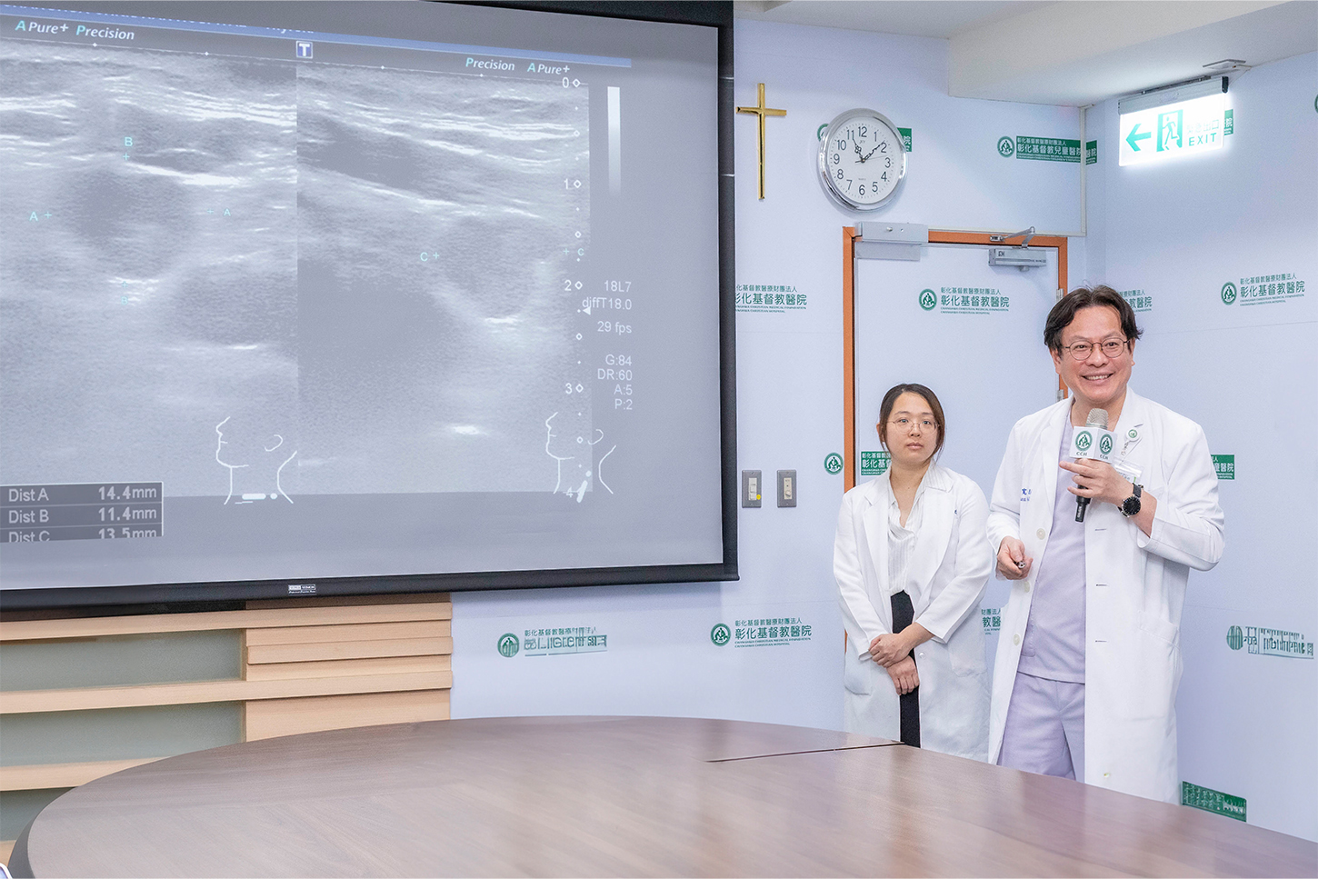 彰基說,在陳穆寬總院長的門診中,智慧精準甲狀腺癌中心主任謝明妤藉由超音波影像找出復發的頸部癌症,隨後透過正子攝影確定執行頸部淋巴擴清根治手術,並在一小時即徹底清除所有的癌細胞。謝明妤主任指出,由於是二次手術,面對組織沾黏與解剖構造改變,手術難度極高。
