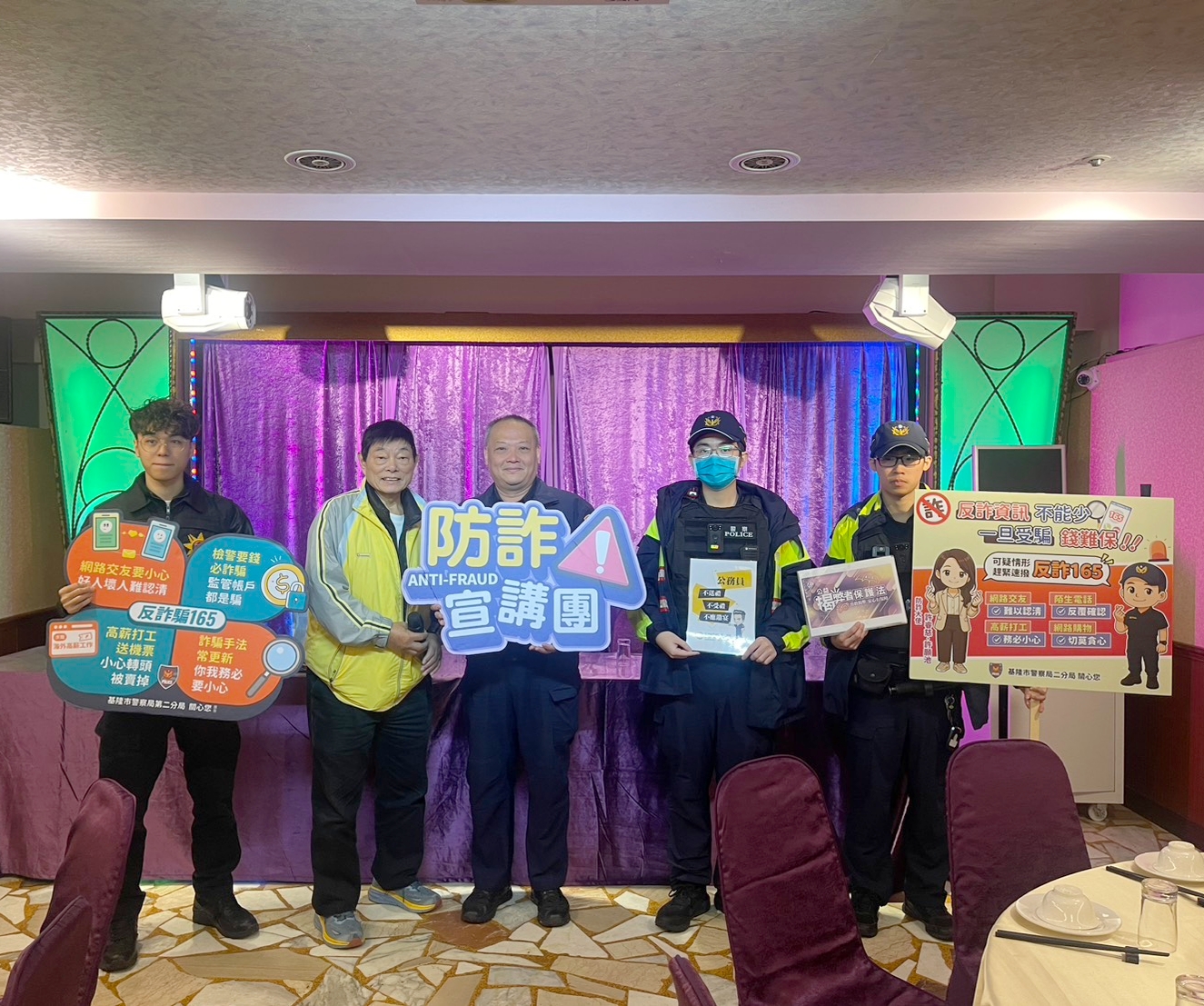 (中)信六路派出所副所長張君豪等員警於北都飯店進行防詐與反毒宣導。圖/翻攝