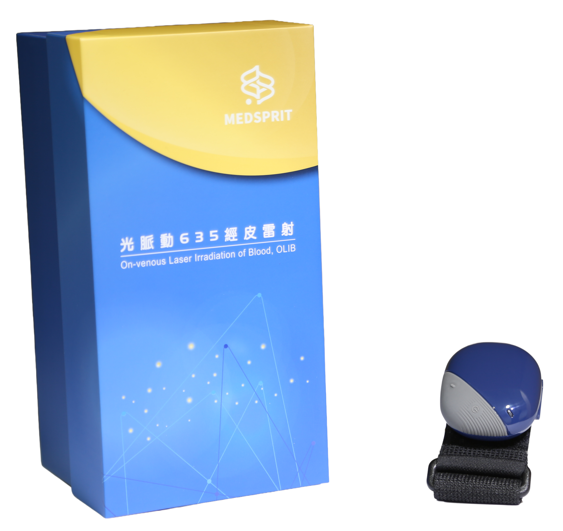 - 此穿戴式靜脈雷射儀為(OLIB)第二類 醫療器材。使用紅光靜脈雷射(OLIB)、波長635nm ,適應症為促進照射部位的局部血液循環進行治療,並使肌肉放鬆,達到緩解疼痛之效果。