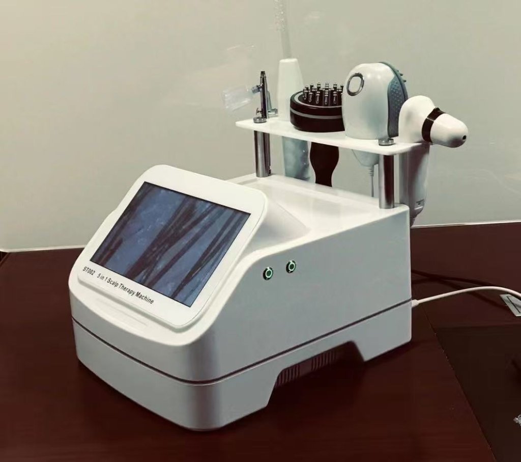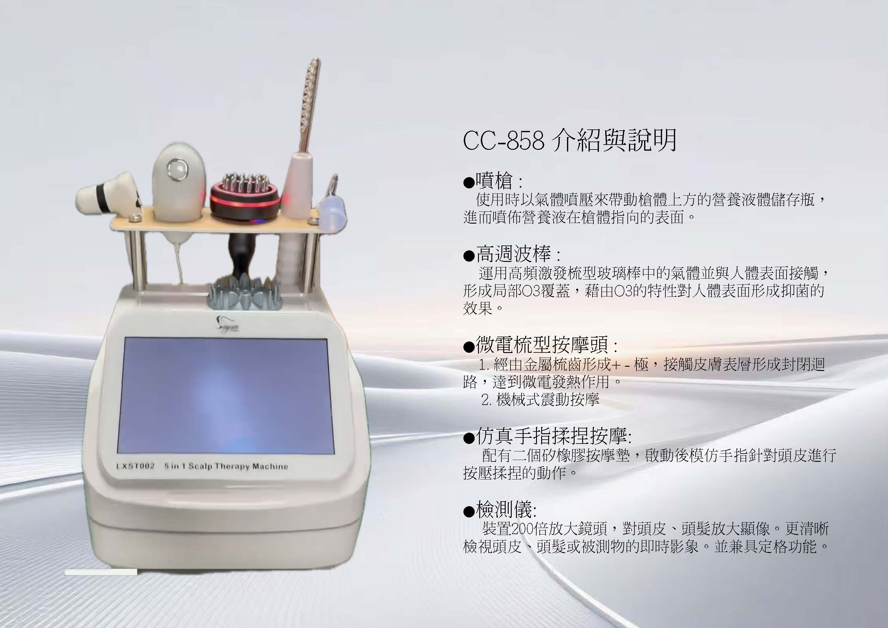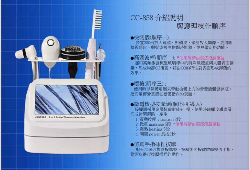 工作原理 1.水霧噴槍是將水置入槍體上方瓶內,再利用高壓氣體將水或營養液細化加壓後噴灑至皮膚表層,使皮膚更方便吸收。 2.震動按摩頭是模仿人手按摩手法,力量均勻且細膩,用於頭皮揉捏趕走疲憊。 3.微電流按摩棒利用微電流交換原理,經由正、負離子交換的作用,協助化妝品自體表導引至皮膚內。 4.肌膚清潔儀是利用玻璃棒內惰性氣體,並在金屬端施予電壓,令管內氣體分子撞擊,形成離子與電漿,進而於燈管周圍處產生臭氧,再利用臭氧將皮膚表面進行清潔。 5.檢測儀是利用高倍率鏡頭配合高像素螢幕,放大膚質現況。功能用途 ▲利用數位多功能美容機,根據不同的營養品配合不同的配件,代替傳統手動塗抹方式,減少營養品流失並增加美容效果。 檢測儀 檢測儀是利用高倍率鏡頭配合高像素螢幕,放 大膚質現況。