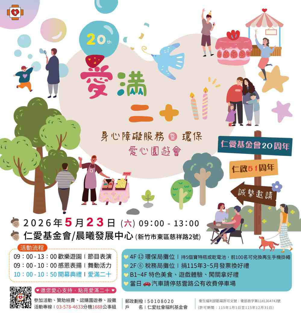新竹市天主教仁愛社會福利基金會感恩歡慶成立二十年,將於115年5月23日(星期六)上午9時至下午1時,在晨曦發展中心(新竹市東區慈祥路2號)舉辦「愛滿二十」身心障礙服務暨環保愛心園遊會。仁愛基金會執行長林湘雅表示,近年募款不易,園遊券銷售未達預期,懇請認購園遊券或贊助服務經費,歡迎社會各界踴躍參加園遊會;目前尚有14個攤位開放報名設攤。