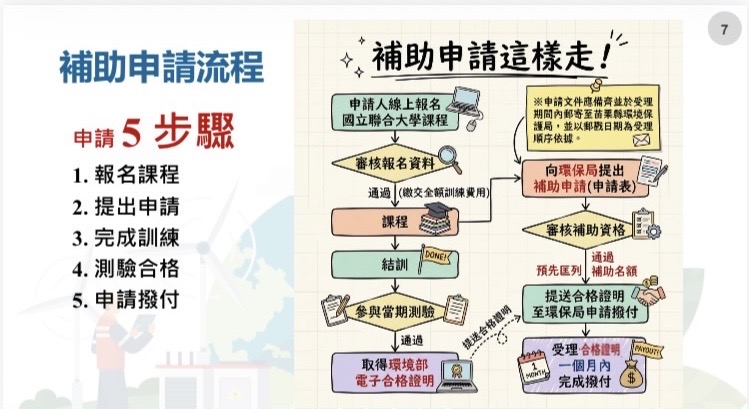 國立聯合大學課程將於115年5月23日開課,相關資訊可至環境部「綠領人才資訊平台」查詢 https://reurl.cc/kprXR9。本次補助名額限30人,符合資格的青年完成課程報名後,即可提出補助申請,名額有限,額滿為止。更多詳情可至苗栗縣環保局氣候變遷調適及減碳平台查詢 https://reurl.cc/A3aA63。