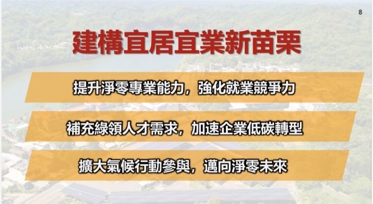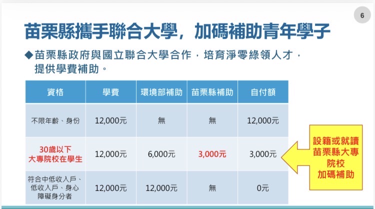 此次計畫由縣府提供30個補助名額,每人補助3,000元,讓學費減半,鼓勵在地青年投入淨零轉型及綠色產業發展,提升未來就業競爭力。