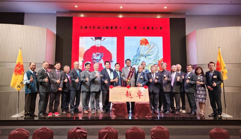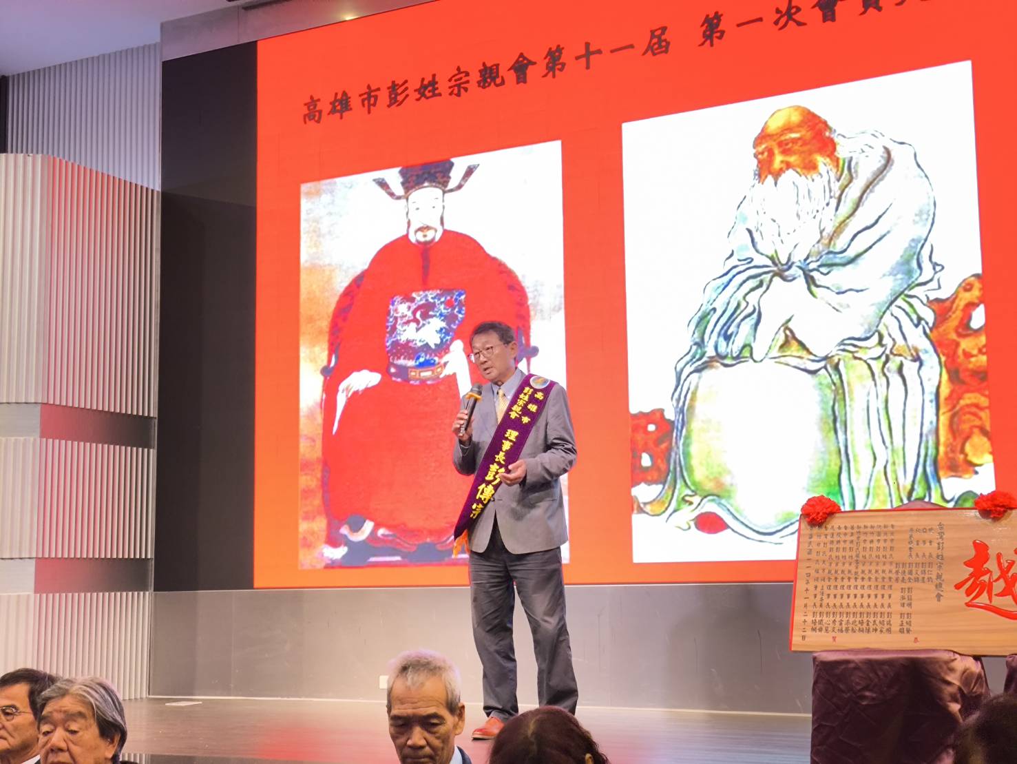 高雄市彭姓宗親會今舉辦第十一屆理監事就職典禮,宗親會依例在會場右側懸掛彭祖繪像,以表慎終追遠之意。全台彭姓後代在各縣市均設有分會,此次典禮,除總會到場輔導,各地宗親也熱情響應,新竹分會更以遊覽車南下,部分宗親前一晚已入住國軍英雄館,展現宗族間一貫的團結情誼。